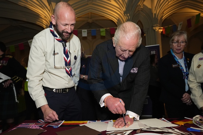 King Charles III draws an outline of his hand during a reception for volunteering charities in Windsor Castle, Berkshire, on day two of the state visit to the UK by the President of the Federal Republic of Germany. Picture date: Thursday December 4, 2025., Credit:Avalon.red / Avalon