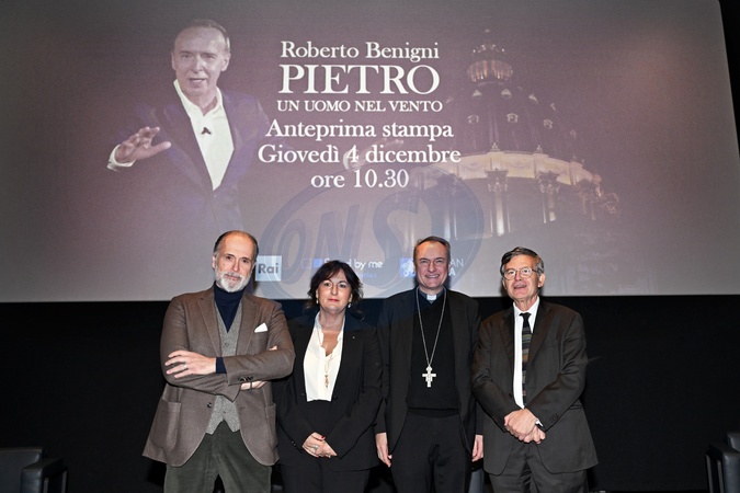 Press preview for Benigni's television show "Pietro, Un Uomo Nel Vento," a monologue dedicated to the history of St. Peter. Pictured: Giampaolo Rossi, CEO of Rai; Simona Ercolani, CEO and Creative Director of Stand By Me; Paolo Ruffini, Prefect of the Dicastery for Communication of the Holy See; and Cardinal Mauro Gambetti, Archpriest of the Papal Basilica of St. Peter in the Vatican and Vicar General of His Holiness for the Vatican City. Rome, Maxxi Auditorium. Rai Cultura. Dec 4th 2025, Credit:Maria Laura Antonelli / Avalon
