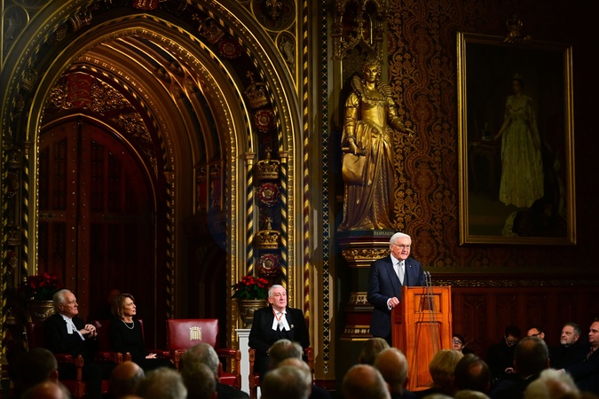 President of the Federal Republic of Germany Frank-Walter Steinmeier addresses members of the House of Lords and the House of Commons in the Royal Gallery at the Palace of Westminster.President of the Federal Republic of Germany Frank-Walter Steinmeier State Visit, Day 2, Address to Parliament, Palace of Westminster, London, UK - 04 Dec 2025, Credit:Victoria Jones/Shutterstock / Avalon