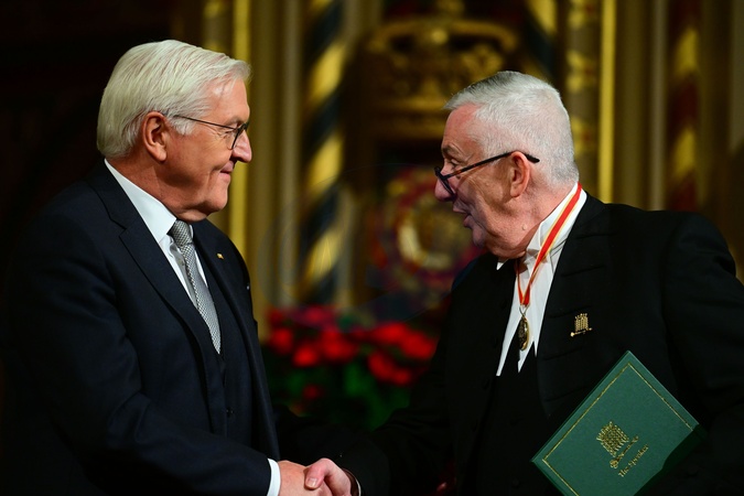 Speaker of the House of Commons Sir Lindsay Hoyle shakes hands with President of the Federal Republic of Germany Frank-Walter Steinmeier in front members of the House of Lords and the House of Commons in the Royal Gallery at the Palace of Westminster.President of the Federal Republic of Germany Frank-Walter Steinmeier State Visit, Day 2, Address to Parliament, Palace of Westminster, London, UK - 04 Dec 2025, Credit:Victoria Jones/Shutterstock / Avalon