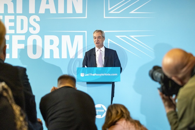 Nigel Farage MP spoke at a Reform UK press conference in Westminster, responding to the cancellation of upcoming elections. The Labour government plans to delay Mayoral elections in Essex, Hampshire and the Solent, Sussex and Brighton, and Norfolk and Suffolk by at least two years., Credit:Abdullah Bailey / Avalon
