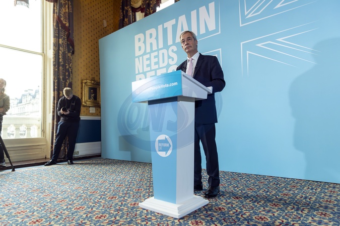 Nigel Farage MP spoke at a Reform UK press conference in Westminster, responding to the cancellation of upcoming elections. The Labour government plans to delay Mayoral elections in Essex, Hampshire and the Solent, Sussex and Brighton, and Norfolk and Suffolk by at least two years., Credit:Abdullah Bailey / Avalon