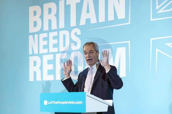 Nigel Farage MP spoke at a Reform UK press conference in Westminster, responding to the cancellation of upcoming elections. The Labour government plans to delay Mayoral elections in Essex, Hampshire and the Solent, Sussex and Brighton, and Norfolk and Suffolk by at least two years., Credit:Abdullah Bailey / Avalon