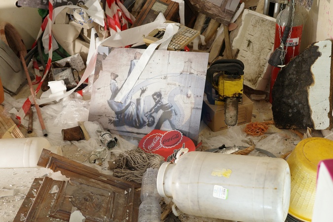 Authorities and the public attend the inauguration of the "Banksy Modeste Collection" exhibition at the Agrigento Chamber of Commerce. Pictured is a display of the Ukrainian section, with debris and exhibit materials. Agrigento. Italy 03 December 2025, Credit:Christian Bonaviri / Avalon