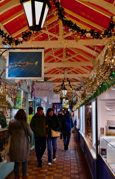 Oxfords historic Covered Market at Christmas. The Covered Market is a historic market with permanent stalls and shops in a large covered structure in central Oxford, England. It was designated a Grade II listed building in 2000, at Christmas Alice In Wonderland figures are illuminated and independent shops are decked out in festive themes. Since its opening in 1774, with its initial 20 butchers' shops, the Covered Market has been an architectural and cultural landmark., Credit:Geoffrey Swaine / Avalon