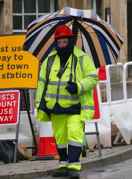 A station construction worker under a bright umbrella in the rain, Credit:Geoffrey Swaine / Avalon