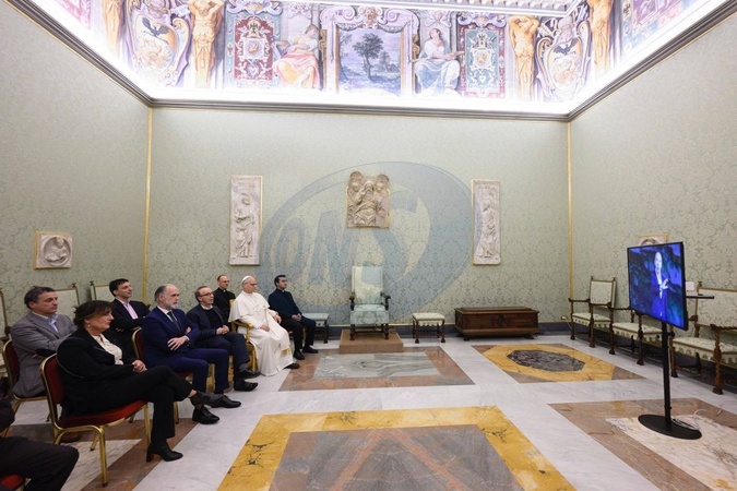 Apostolic Palace. Pope Leo XIV met with Roberto Benigni for the monologue "Peter, a Man in the Wind," which will be broadcast on Rai1 on December 10th in prime time and which had its world premiere this morning at the MAXXI Museum in Rome. The Pope watched excerpts from the monologue: "How beautiful, it's about love," he commented afterward. During the meeting, before the screening, the Pope and Benigni discussed cinema and "Life is Beautiful," which the Pope listed among his four favorite films. Vatican City, Italy 04 December 2025, Credit:Vatican Media / Avalon