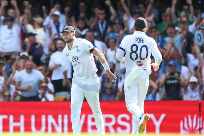 Gus Atkinson of England celebrates the dismissal of Travis Head of Australia during the NRMA Insurance Ashes Second Test Day 2 Australia vs England at The Gabba, Brisbane Cricket Ground, Brisbane, Australia, 5th December 2025, Credit:Pat Hoelscher/News Images / Avalon