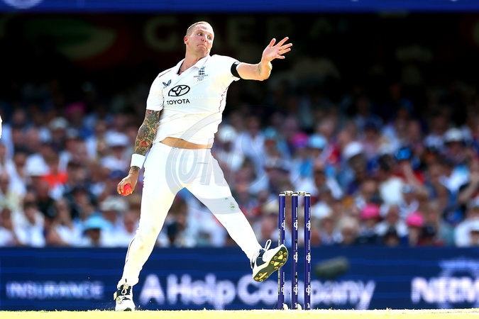 Brydon Carse of England bowls during the NRMA Insurance Ashes Second Test Day 2 Australia vs England at The Gabba, Brisbane Cricket Ground, Brisbane, Australia, 5th December 2025, Credit:Pat Hoelscher/News Images / Avalon
