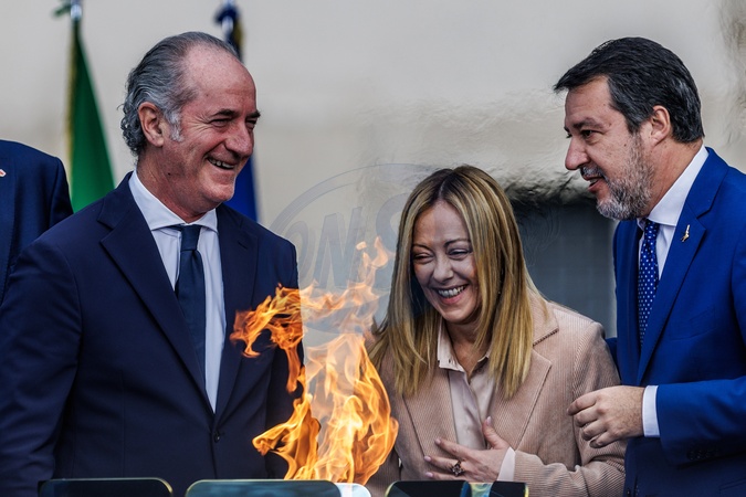Inauguration Ceremony of the Olympic Torch Relay Journey. Pictured are Prime Minister Giorgia Meloni, Minister of Infrastructure and Transport Matteo Salvini, and Luca Zaia. Rome, Dec 5th 2025, Credit:/AGF / Avalon