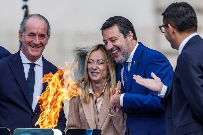 Inauguration Ceremony of the Olympic Torch Relay Journey. Pictured are Prime Minister Giorgia Meloni, Minister of Infrastructure and Transport Matteo Salvini, and Luca Zaia. Rome, Dec 5th 2025, Credit:/AGF / Avalon