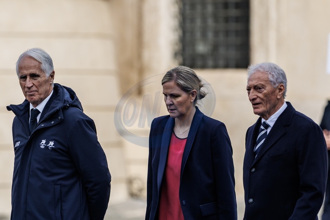 Inauguration Ceremony of the Olympic Torch Relay. Pictured are Andrea Malago', the President of the International Olympic Committee, Kirsty Coventry, and the President of CONI, Luciano Bonfiglio. Rome, Dec 5th 2025, Credit:/AGF / Avalon