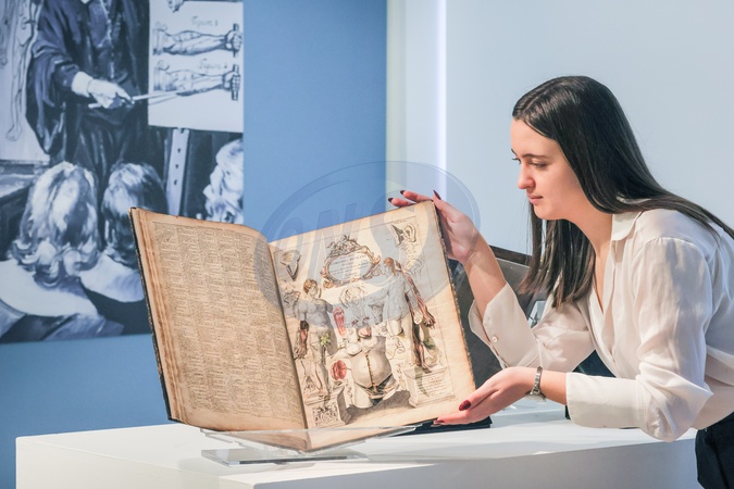 London, UK. 05th Dec, 2025. Christie's staff with a hand-coloured Restoration-era pop-up anatomy, with presentation leaf to Nell Gwyn. Estimate: £15,000–20,000. Scholars teaching anatomy can be seen in the background.Christie's Valuable Books & Manuscripts sale, part of Classic Week, will be on 10 December, 2025., Credit:Imageplotter / Avalon