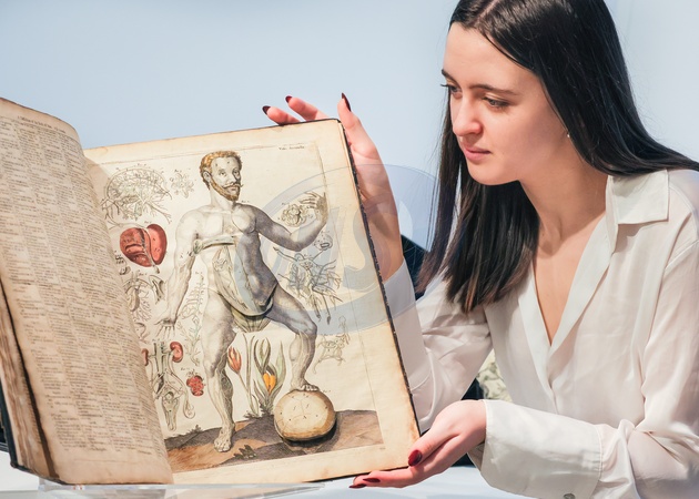 London, UK. 05th Dec, 2025. Christie's staff with a hand-coloured Restoration-era pop-up anatomy, with presentation leaf to Nell Gwyn. Estimate: £15,000–20,000. Christie's Valuable Books & Manuscripts sale, part of Classic Week, will be on 10 December, 2025., Credit:Imageplotter / Avalon