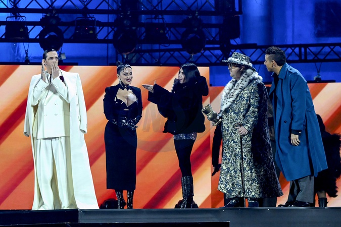 X Factor 2025 Finale in Piazza del Plebiscito. Pictured: Giorgia, Paola Iezzi, Jake La Furia, Achille Lauro, and Francesco Gabbani. Naples, Dec 4th 2025, Credit:AGF / Avalon