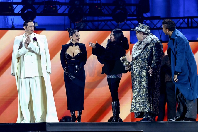 X Factor 2025 Finale in Piazza del Plebiscito. Pictured: Giorgia, Paola Iezzi, Jake La Furia, Achille Lauro, and Francesco Gabbani. Naples, Dec 4th 2025, Credit:AGF / Avalon