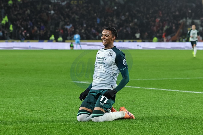 Morgan Whittaker of Middlesbrough celebrates his goal to make it 0-3 during the Sky Bet Championship match Hull City vs Middlesbrough at MKM Stadium, Hull, United Kingdom, 5th December 2025, Credit:Mark Cosgrove/News Images / Avalon