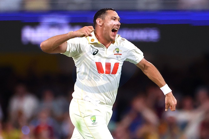 Scott Boland of Australia celebrates the dismissal of Harry Brook of England during Day 3 of the Second Test in the NRMA Insurance Ashes Series Australia vs England at The Gabba, Brisbane Cricket Ground, Brisbane, Australia, 6th December 2025, Credit:Patrick Hoelscher/News Images / Avalon