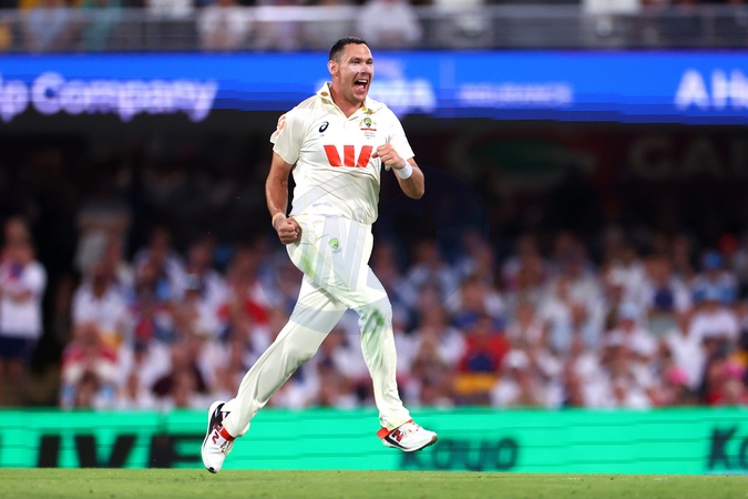 Scott Boland of Australia celebrates the dismissal of Harry Brook of England during Day 3 of the Second Test in the NRMA Insurance Ashes Series Australia vs England at The Gabba, Brisbane Cricket Ground, Brisbane, Australia, 6th December 2025, Credit:Patrick Hoelscher/News Images / Avalon