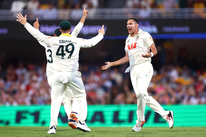Scott Boland of Australia celebrates the dismissal of Harry Brook of England during Day 3 of the Second Test in the NRMA Insurance Ashes Series Australia vs England at The Gabba, Brisbane Cricket Ground, Brisbane, Australia, 6th December 2025, Credit:Patrick Hoelscher/News Images / Avalon