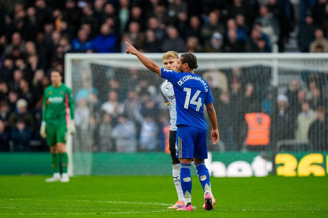 Scorer of the first goal Bobby Decordova-Reid of Leicester City makes a gesture at the centre circle just before the game restarts following a goal to make it 0-2 during the Sky Bet Championship match Derby County vs Leicester City at Pride Park Stadium, Derby, United Kingdom, 6th December 2025, Credit:Maynard Manyowa/News Images / Avalon