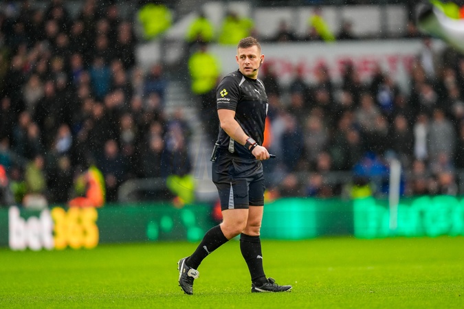 Referee Josh Smith during the Sky Bet Championship match Derby County vs Leicester City at Pride Park Stadium, Derby, United Kingdom, 6th December 2025, Credit:Maynard Manyowa/News Images / Avalon