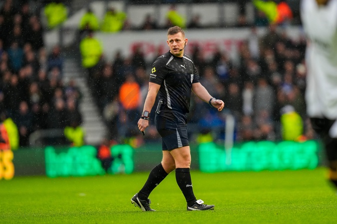 Referee Josh Smith during the Sky Bet Championship match Derby County vs Leicester City at Pride Park Stadium, Derby, United Kingdom, 6th December 2025, Credit:Maynard Manyowa/News Images / Avalon