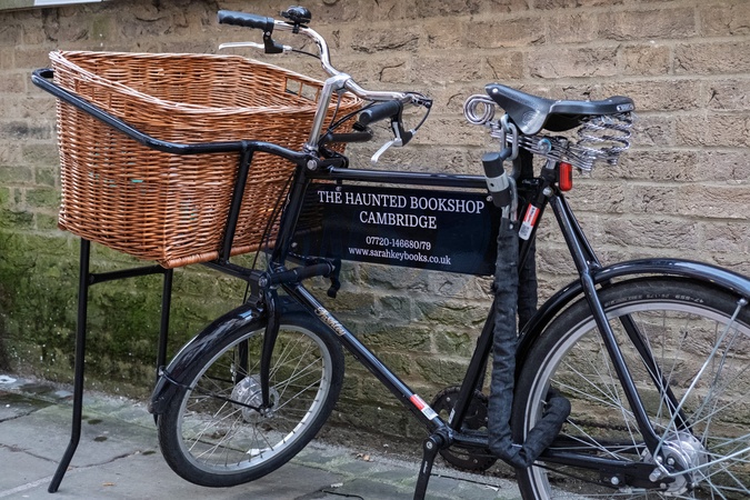 Bicycle advertising the haunted book shop in the centre of Cambridge, Cambridgeshire. UK