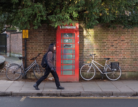 Pedestrian walking past old telephone kiosk converted to tourist information, Bridge street, Cambridge, Cambridgeshire, UK. 05 December 2025., Credit:Mark fairhurst / Avalon