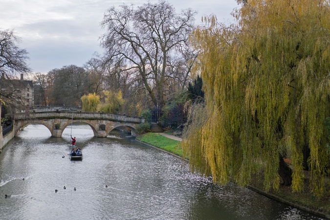 Punting along the River Cam by "The Backs" in December. Cambridge, Cambridgeshire. UK