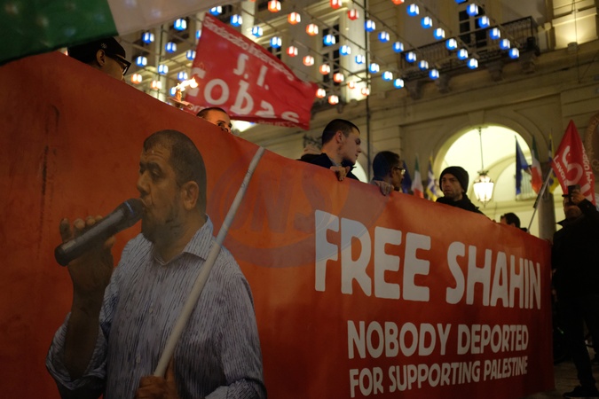 December 5, 2025, Turin, Piazza Palazzo di Città. A demonstration, simultaneously in several Italian squares, for Turin imam Mohamed Shahin, incarcerated in the Caltanissetta CPR awaiting repatriation to Egypt. He is charged with justifying the October 7 massacre., Credit:Selene Daniele / Avalon