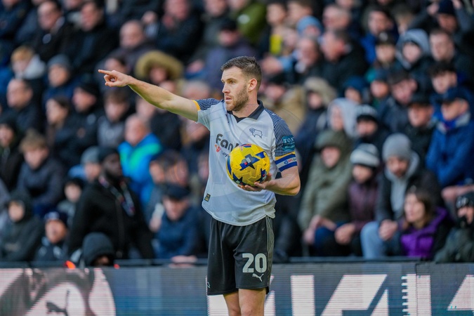 Callum Elder of Derby County prepares to take a throw in during the Sky Bet Championship match Derby County vs Leicester City at Pride Park Stadium, Derby, United Kingdom, 6th December 2025, Credit:Maynard Manyowa/News Images / Avalon