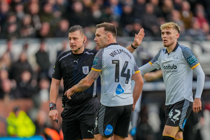 Andreas Weimann of Derby County and Bobby Clark of Derby County speak to the referee during the Sky Bet Championship match Derby County vs Leicester City at Pride Park Stadium, Derby, United Kingdom, 6th December 2025, Credit:Maynard Manyowa/News Images / Avalon