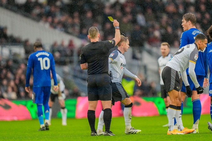 Liam Thompson of Derby County is shown a yellow card during the Sky Bet Championship match Derby County vs Leicester City at Pride Park Stadium, Derby, United Kingdom, 6th December 2025, Credit:Maynard Manyowa/News Images / Avalon