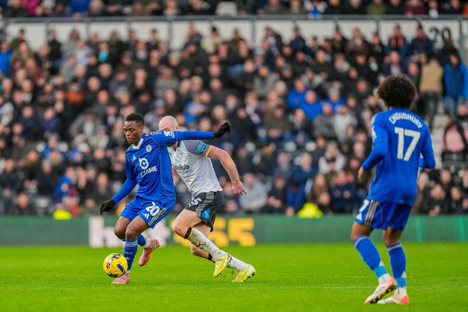 Patson Daka of Leicester City rides a challenge and dribbles past Matthew Clarke of Derby County during the Sky Bet Championship match Derby County vs Leicester City at Pride Park Stadium, Derby, United Kingdom, 6th December 2025, Credit:Maynard Manyowa/News Images / Avalon