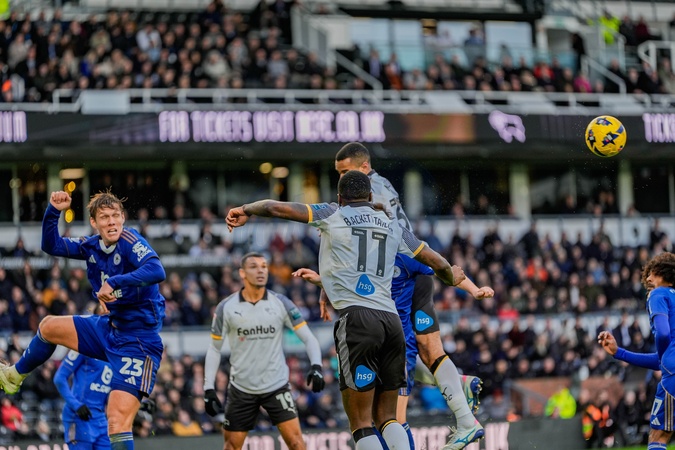 Jannik Vestergaard of Leicester City and Corey Blackett-Taylor of Derby County leap to head the ball during the Sky Bet Championship match Derby County vs Leicester City at Pride Park Stadium, Derby, United Kingdom, 6th December 2025, Credit:Maynard Manyowa/News Images / Avalon