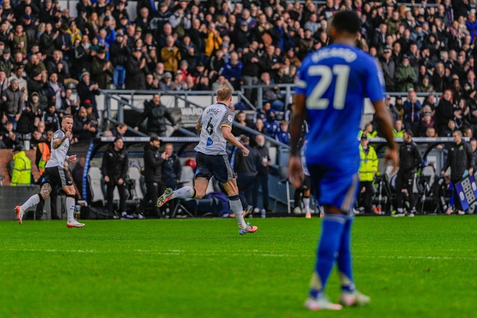 Sondre Langås of Derby County celebrates and runs back to the mark after scoring to make it 1-3 during the Sky Bet Championship match Derby County vs Leicester City at Pride Park Stadium, Derby, United Kingdom, 6th December 2025, Credit:Maynard Manyowa/News Images / Avalon