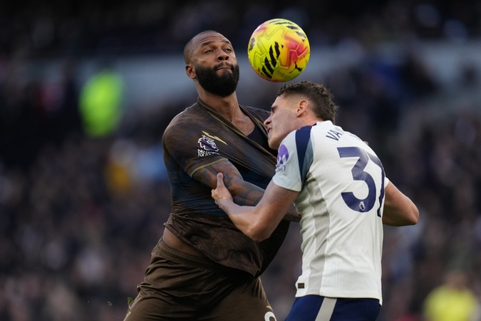 Igor Thiago of Brentford and Micky van de Ven of Tottenham Hotspur battle during the Premier League match Tottenham Hotspur vs Brentford at Tottenham Hotspur Stadium, London, United Kingdom, 6th December 2025, Credit:Harvey Murphy/News Images / Avalon