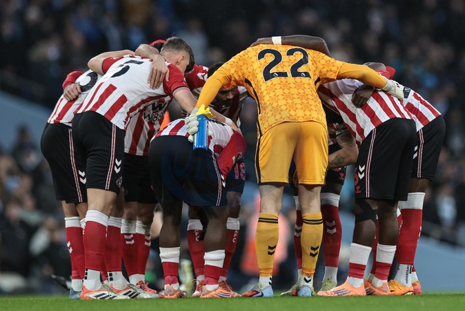 Sunderland team huddle during the Premier League match Manchester City vs Sunderland at Etihad Stadium, Manchester, United Kingdom, 6th December 2025, Credit:Mark Cosgrove/News Images / Avalon