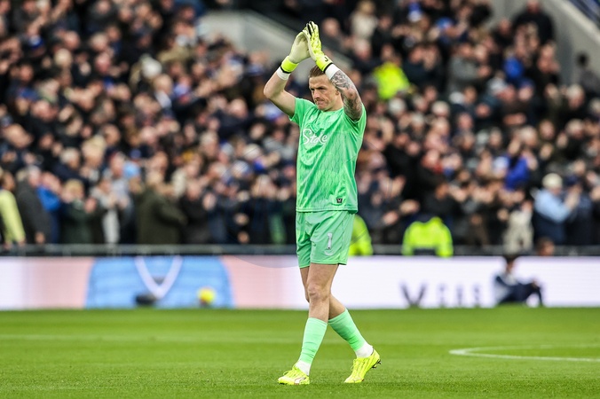 Everton goalkeeper Jordan Pickford celebrates an early goal from Kiernan Dewsbury-Hall of Everton to make the score 1-0 during the Premier League match Everton vs Nottingham Forest at Hill Dickinson Stadium, Liverpool, United Kingdom, 6th December 2025, Credit:Ae Cosgrove/News Images / Avalon