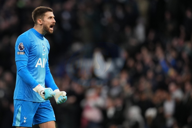 Guglielmo Vicario of Tottenham Hotspur celebrates 2-0 lead during the Premier League match Tottenham Hotspur vs Brentford at Tottenham Hotspur Stadium, London, United Kingdom, 6th December 2025, Credit:Harvey Murphy/News Images / Avalon