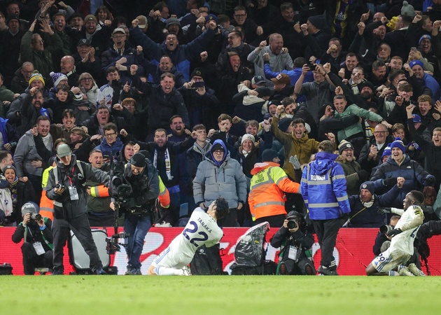 Ao Tanaka of Leeds United celebrates his goal to make it 3-3 during the Premier League match Leeds United vs Liverpool at Elland Road, Leeds, United Kingdom, 6th December 2025, Credit:Richard Bierton/News Images / Avalon