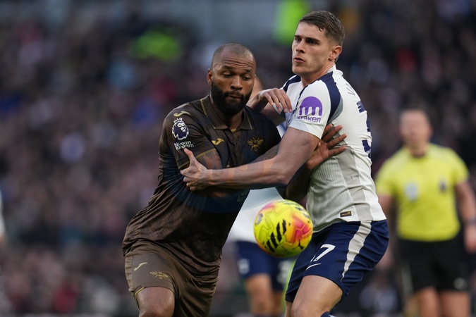Igor Thiago of Brentford and Micky van de Ven of Tottenham Hotspur battle for the ball during the Premier League match Tottenham Hotspur vs Brentford at Tottenham Hotspur Stadium, London, United Kingdom, 6th December 2025, Credit:Harvey Murphy/News Images / Avalon