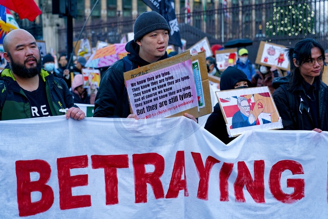 London, UK. 06th December 2025. Protest against China's proposed mega-embassy. The march started in Piccadilly Circus passing Whitehall, Westminster and ended at the Home Office HQ.The aim of the protest is to pressure Secretary of State, Steve Reed MP into rejecting China's proposed mega-Embassy in London., Credit:Aldo Ciarrocchi / Avalon