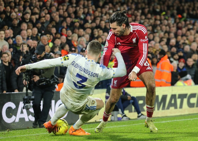 Gabriel Gudmundsson of Leeds United is pushed to the ground by Dominik Szoboszlai of Liverpool during the Premier League match Leeds United vs Liverpool at Elland Road, Leeds, United Kingdom, 6th December 2025, Credit:Richard Bierton/News Images / Avalon