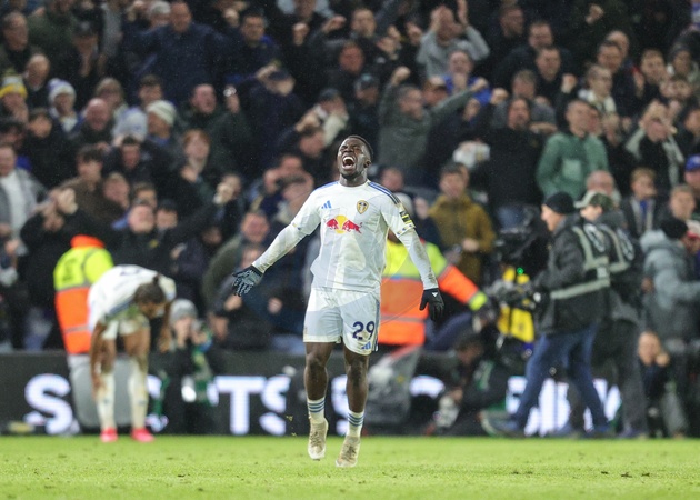 Wilfried Gnonto of Leeds United celebrates during the Premier League match Leeds United vs Liverpool at Elland Road, Leeds, United Kingdom, 6th December 2025, Credit:Richard Bierton/News Images / Avalon