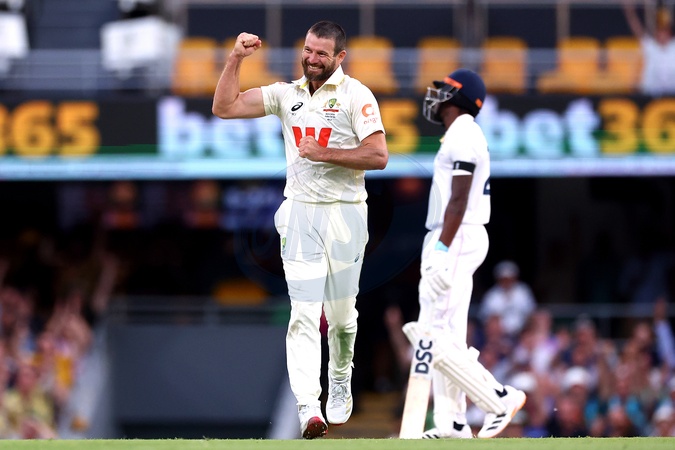 Michael Neser of Australia celebrates his 5th wicket and the dismissal of Brydon Carse of England during the day 4 of the Second Test in the NRMA Insurance Ashes Series Australia vs England at The Gabba, Brisbane Cricket Ground, Brisbane, Australia, 7th December 2025, Credit:Pat Hoelscher/News Images / Avalon