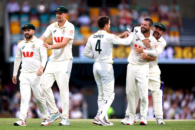 Michael Neser of Australia celebrates his 5th wicket and the dismissal of Brydon Carse of England during the day 4 of the Second Test in the NRMA Insurance Ashes Series Australia vs England at The Gabba, Brisbane Cricket Ground, Brisbane, Australia, 7th December 2025, Credit:Pat Hoelscher/News Images / Avalon
