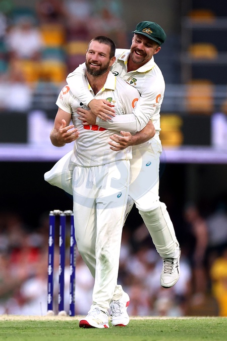 Michael Neser of Australia celebrates his 5th wicket and the dismissal of Brydon Carse of England during the day 4 of the Second Test in the NRMA Insurance Ashes Series Australia vs England at The Gabba, Brisbane Cricket Ground, Brisbane, Australia, 7th December 2025, Credit:Pat Hoelscher/News Images / Avalon