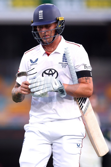 Brydon Carse of England is dismissed during the day 4 of the Second Test in the NRMA Insurance Ashes Series Australia vs England at The Gabba, Brisbane Cricket Ground, Brisbane, Australia, 7th December 2025, Credit:Pat Hoelscher/News Images / Avalon